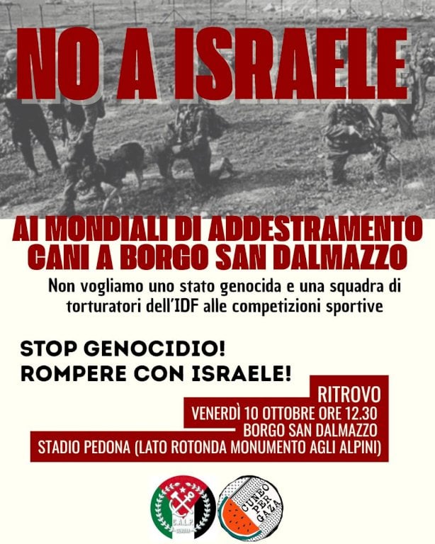 "Della squadra israeliana - si legge nel comunicato - fanno parte persino attuali o ex membri dell’unità cinofila dell’Idf, l’esercito israeliano che sta realizzando il genocidio del popolo palestinese, anche utilizzando i cani contro i prigionieri (come hanno visto nei giorni scorsi gli attivisti della Global Sumud Flotilla). Crediamo tutto ciò sia inaccettabile e intendiamo attivarci per contestare pacificamente ma fermamente la partecipazione a competizioni sul nostro territorio della squadra di uno Stato genocida e terrorista”.