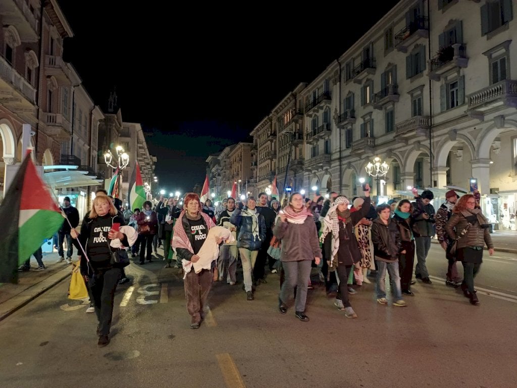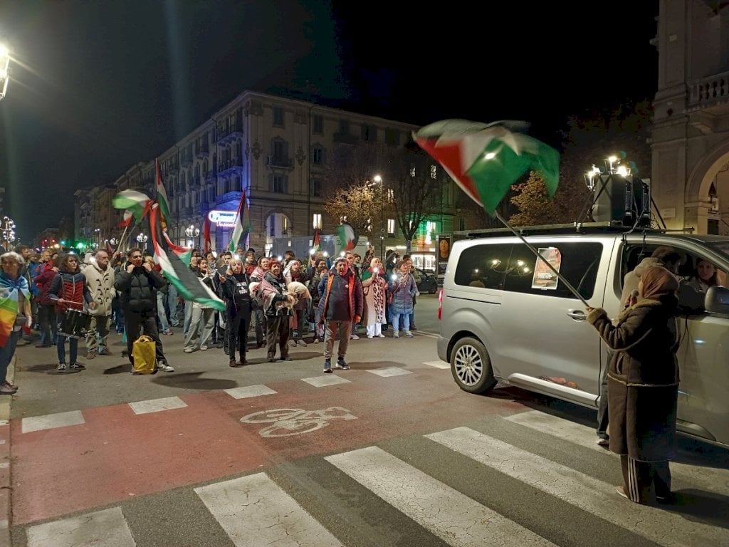 Oltre 150 i partecipanti alla partenza del corteo, secondo gli organizzatori. Uno di loro, prima che gli attivisti si muovano verso piazza Galimberti, annuncia la partecipazione della referente piemontese del Global Movement to Gaza (i promotori della Sumud Flotilla) e legge un comunicato a nome del coordinamento: “Quello che accade a Gaza non è un'eccezione, è parte di un sistema globale di guerra, di occupazione, di violenza”. Sono decine i conflitti armati nel mondo e “almeno cinque le guerre che stanno segnando il destino dell’umanità”: si citano oltre al conflitto israelo-palestinese la guerra in Ucraina che prosegue da oltre tre anni, quella in Sudan “dove oltre 12 milioni di persone sono state costrette a fuggire dalle case”, le guerre civili in Congo e in Yemen.