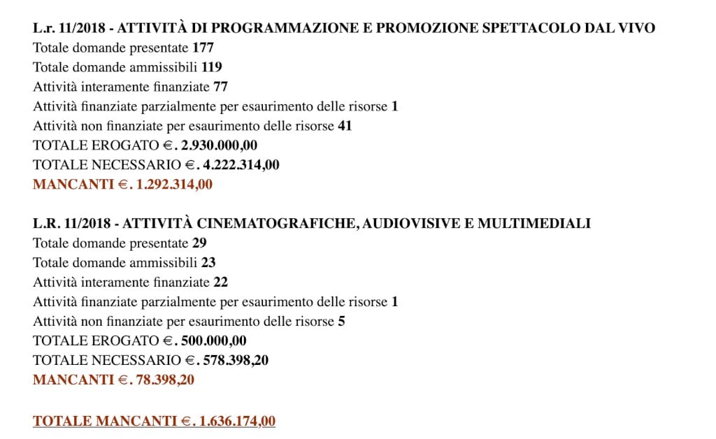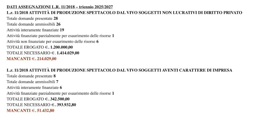 Secondo i dati delle ultime assegnazioni, circa il 30% dei progetti formalmente ammissibili non ha ricevuto alcun finanziamento, nemmeno parziale. "Una situazione che rischia di compromettere la continuità delle attività, con gravi conseguenze sul piano occupazionale, creativo e sociale. Per molti soggetti non finanziati, questo scenario apre un periodo critico che mette a rischio la loro stessa sopravvivenza".