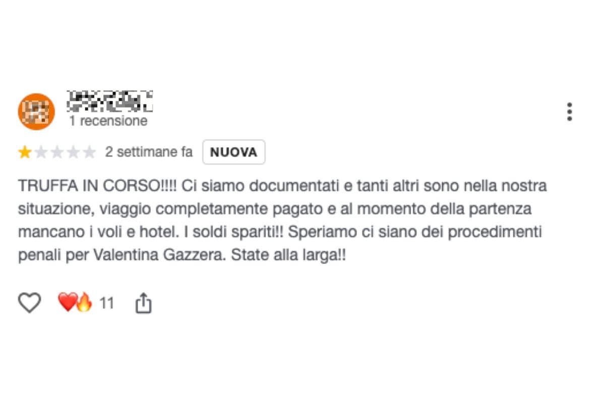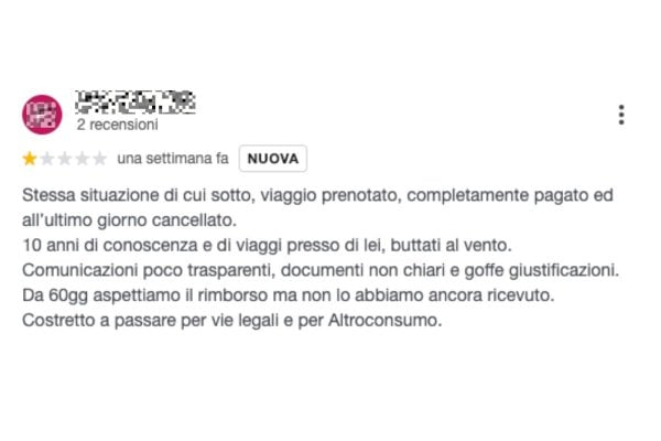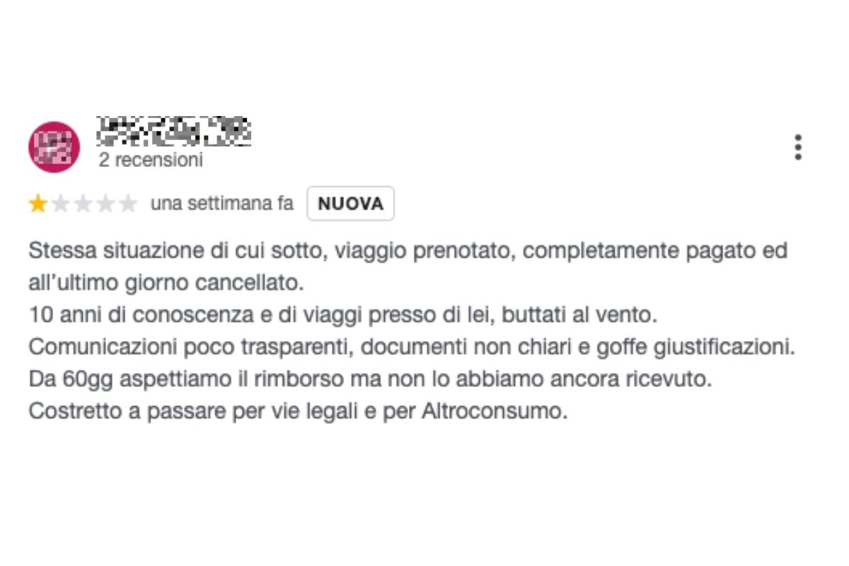 Anche sulla pagina Google dell’agenzia, poco prima che le recensioni venissero bloccate, sono comparsi commenti molto duri: c’è chi parla apertamente di “truffa”, chi racconta di viaggi completamente pagati e cancellati all’ultimo giorno, chi denuncia comunicazioni poco chiare e rimborsi attesi da mesi senza esito.
