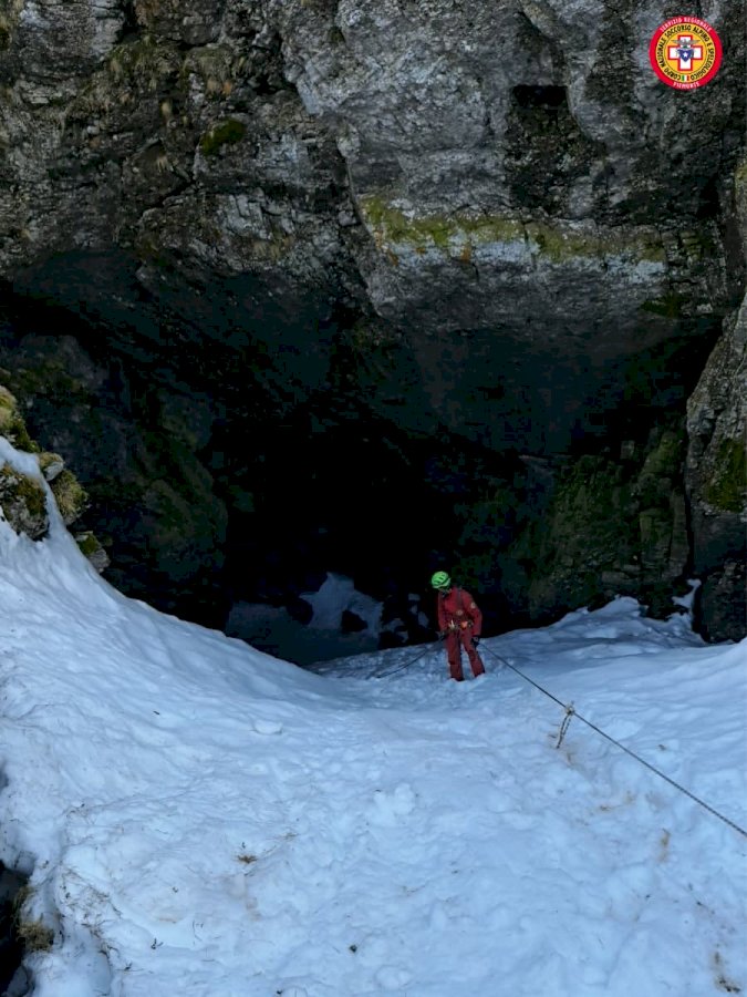 La fase di avvicinamento ha rappresentato uno degli elementi più impegnativi dell’intervento: i soccorritori hanno percorso circa 12 chilometri su neve, con un dislivello positivo di 800 metri e accumuli nevosi superiori ai due metri, trasportando a spalla il materiale tecnico necessario per le operazioni in grotta. Una volta raggiunto l’ingresso, le squadre hanno effettuato la discesa nella cavità e il successivo recupero del figurante dalla quota di -100 metri, superando ostacoli naturali significativi, tra cui un pozzo da 20 metri, uno da 40 metri e diversi tratti meandriformi.