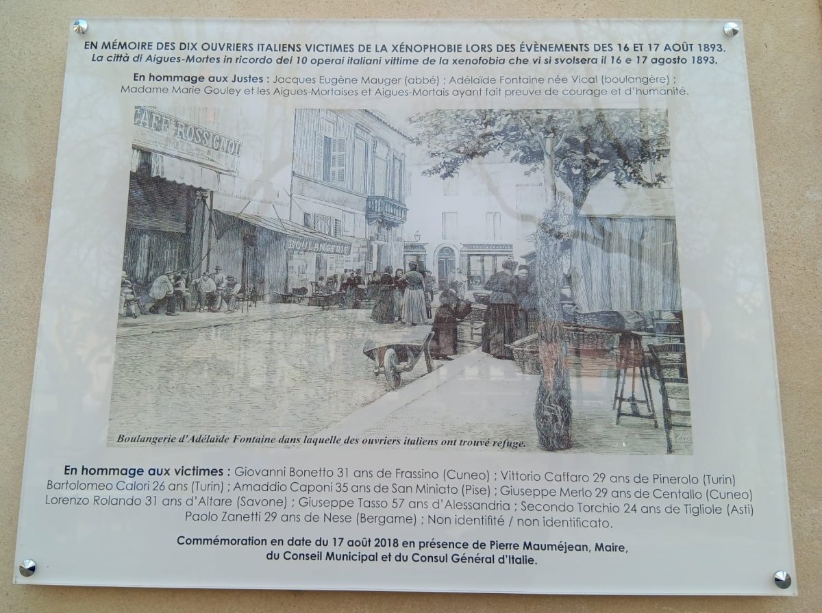 La posa della targa è frutto dell’impegno di Enzo Barnabà, lo storico che da anni si occupa del tragico episodio in cui un gruppo di lavoratori italiani impiegati nelle saline della cittadina francese venne massacrato dalla folla inferocita con l’accusa di sottrarre lavoro alla manodopera locale.