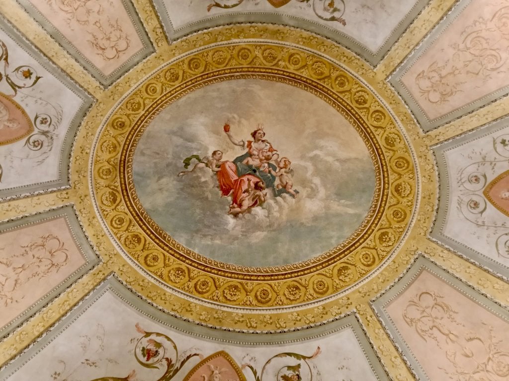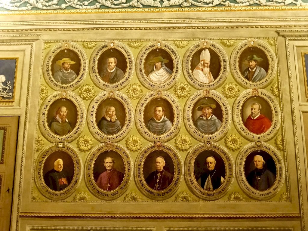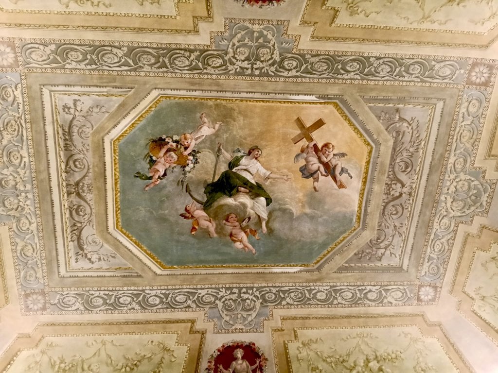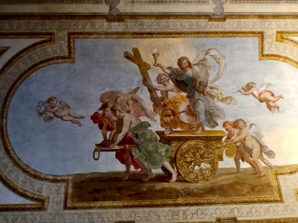 Il percorso espositivo si apre nella prima sala, detta delle Lauree, poiché proprio qui si trovava l’antica Università di Mondovì, attiva tra il 1560 e il 1566, unica sede universitaria del Ducato di Savoia in quel periodo. Le facoltà erano quelle classiche dell’epoca – diritto e teologia – ma includeva anche la medicina, segno di un ambiente innovativo. L’università rimase operativa fino alla fine del Settecento. Le pareti della sala ospitano una serie di raffigurazioni di monregalesi illustri, volute alla fine del Cinquecento dal vescovo Castrucci per ricordare figure di rilievo del territorio. Nel Settecento fu aggiunta anche l’immagine di Emanuele Filiberto, duca di Savoia, celebrato come il promotore della costruzione del Santuario di Vicoforte, ma non senza ambivalenze nella memoria locale: fu infatti colui che nel 1573 fece demolire la splendida cattedrale rinascimentale di Mondovì, accusata di essere rifugio di eretici, per costruire al suo posto la Cittadella. Sul soffitto della sala spicca la prima delle tre raffigurazioni allegoriche delle virtù teologali – Fede, Speranza e Carità – nelle sale seguenti saranno raffigurate, sempre sui soffitti, le altre.