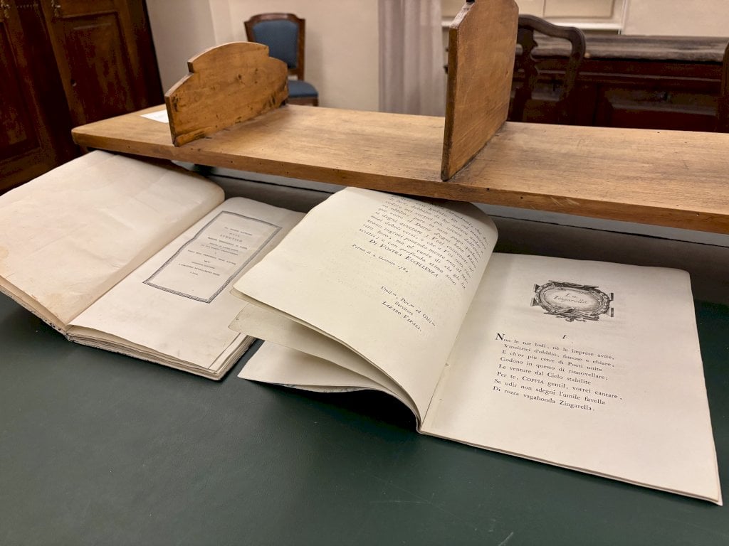 Piemonte. Due preziose edizioni bodoniane appartenenti alla collezione privata del professore diventano, infatti, patrimonio cittadino. I due volumi sono: “Pel solenne battesimo di S.A.R. Ludovico principe primogenito di Parma portato alla fonte da Sua Maestà Cristianissima e dalla Real Principessa delle Asturie. Iscrizioni esotiche e caratteri novellamente incisi e fusi”, Parma, Reale Stamperia, 1774, con la firma di Carlo Muletti risalente al 1801; “La Zingarella. Ottave in occasione delle faustissime nozze... Girolamo Buonvisi con... Anna Sardi”, di Lazzaro Vitali, Parma, Stamperia Reale, 1784.