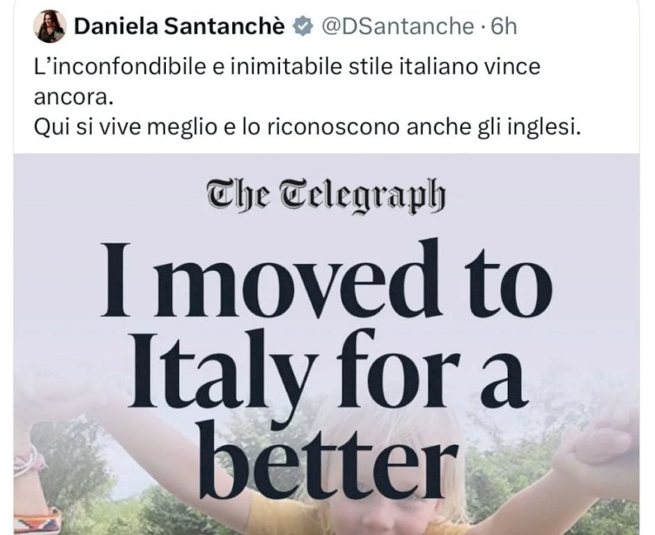 Sarà anche per questo che il ministro del turismo Daniela Santanchè ha subito rilanciato in un tweet l’articolo intitolato “I moved to Italy for a better life”: “L’inconfondibile e inimitabile stile italiano vince ancora. Qui si vive meglio e lo riconoscono anche gli inglesi”.