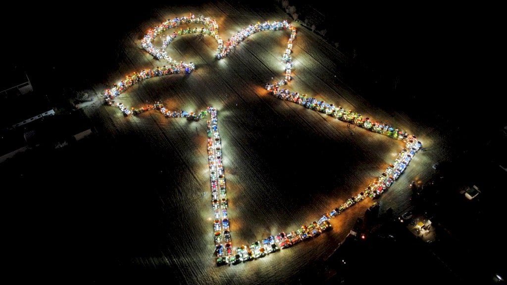 Fin dal primo pomeriggio i trattori hanno iniziato ad arrivare a Savella, dove sono stati disposti in campo per una figura di dimensioni ciclopiche, osservabile solo dal cielo, a tema natalizio. Non una sfilata, non una semplice esposizione di mezzi, ma un evento che parla di creatività, di orgoglio per il lavoro agricolo. Al calar del sole, fari e lampeggianti dei mezzi agricoli sono stati accesi per “illuminare” l’angelo, fotografato dal cielo con un drone.