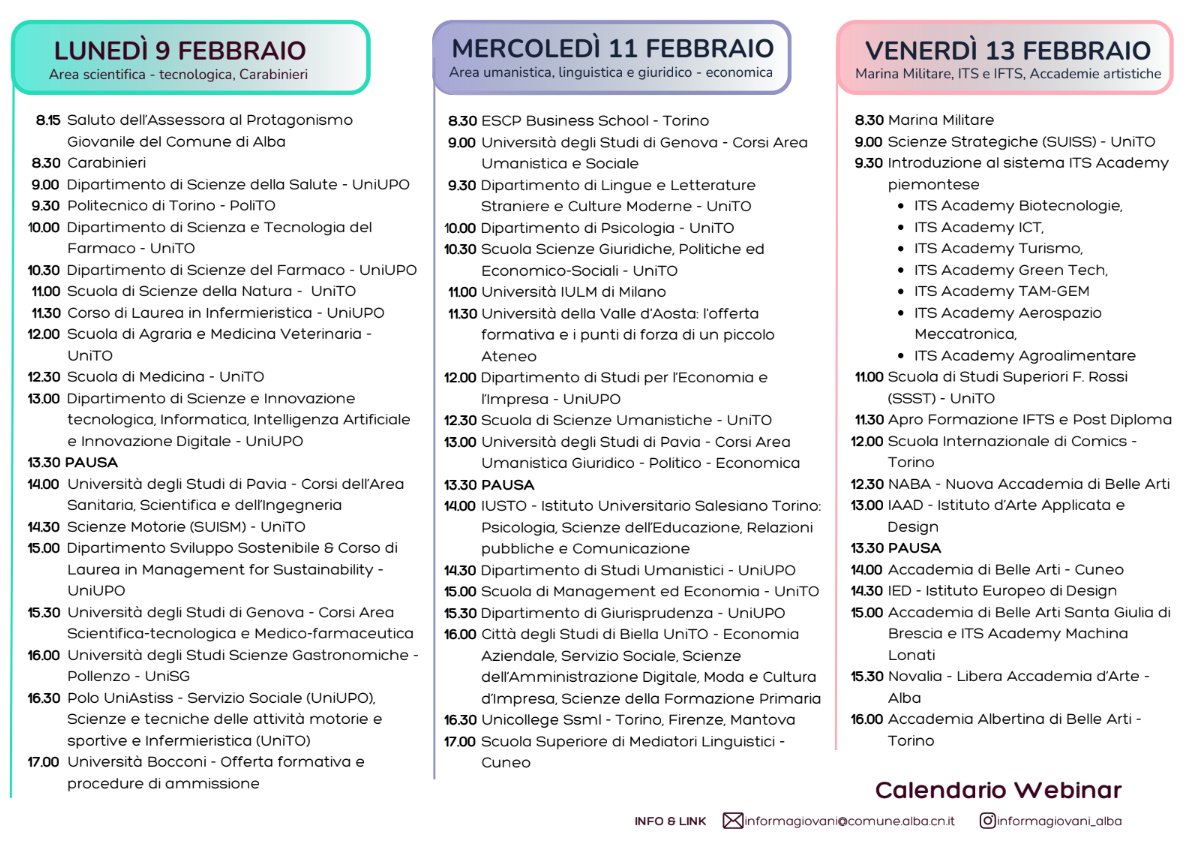 A partire dal 9 febbraio è in programma una “tre giorni” intensiva, che mira a offrire una panoramica capace di rispondere a tutte le domande degli studentiLunedì 9, mercoledì 11 e venerdì 13 febbraio l’Ufficio Informagiovani del Comune di Alba organizza il salone dell’Orientamento Universitario e Post Diploma on-line.