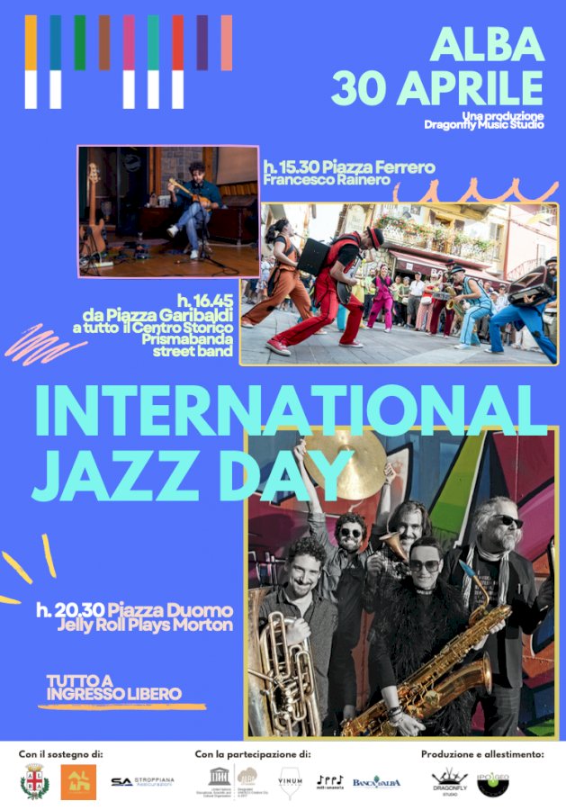 Giovedì 30 aprile torna per il quattordicesimo anno ad Alba l’International Jazz Day: un pomeriggio fra swing e new Orleans con Francesco Rainero e la street band Prismabanda che da piazza Garibaldi percorrerà le vie centrali per concludere in piazza Duomo, dove dalle 20.30 si esibirà il quintetto guidato da Helga Plankensteiner “Jelly Roll Plays Morton”.