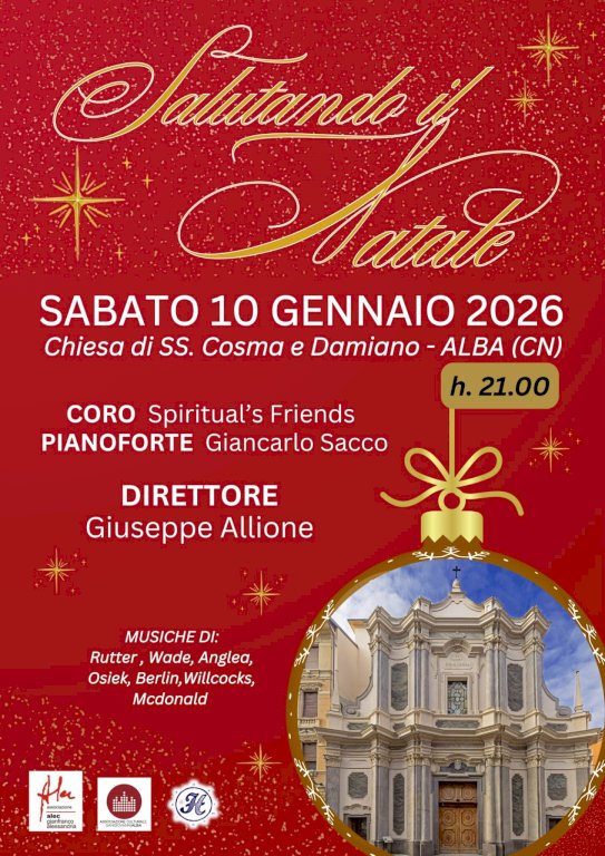 L'evento si terrà il 10 gennaio alle ore 21. Sarà condotto dal Coro Spiritual’s Friends, diretto da Giuseppe AllioneSabato 10 gennaio, presso la chiesa dei Santi Cosma e Damiano di Alba, si terrà il concerto natalizio Salutando il Natale, con inizio alle ore 21. Protagonista della serata sarà il Coro Spiritual’s Friends, diretto da Giuseppe Allione, con Giancarlo Sacco al pianoforte. In programma musiche di Rutter, Wade, Anglea, Osiek, Berlin, Willcocks e McDonald, per un appuntamento all’insegna dell’atmosfera e della suggestione.