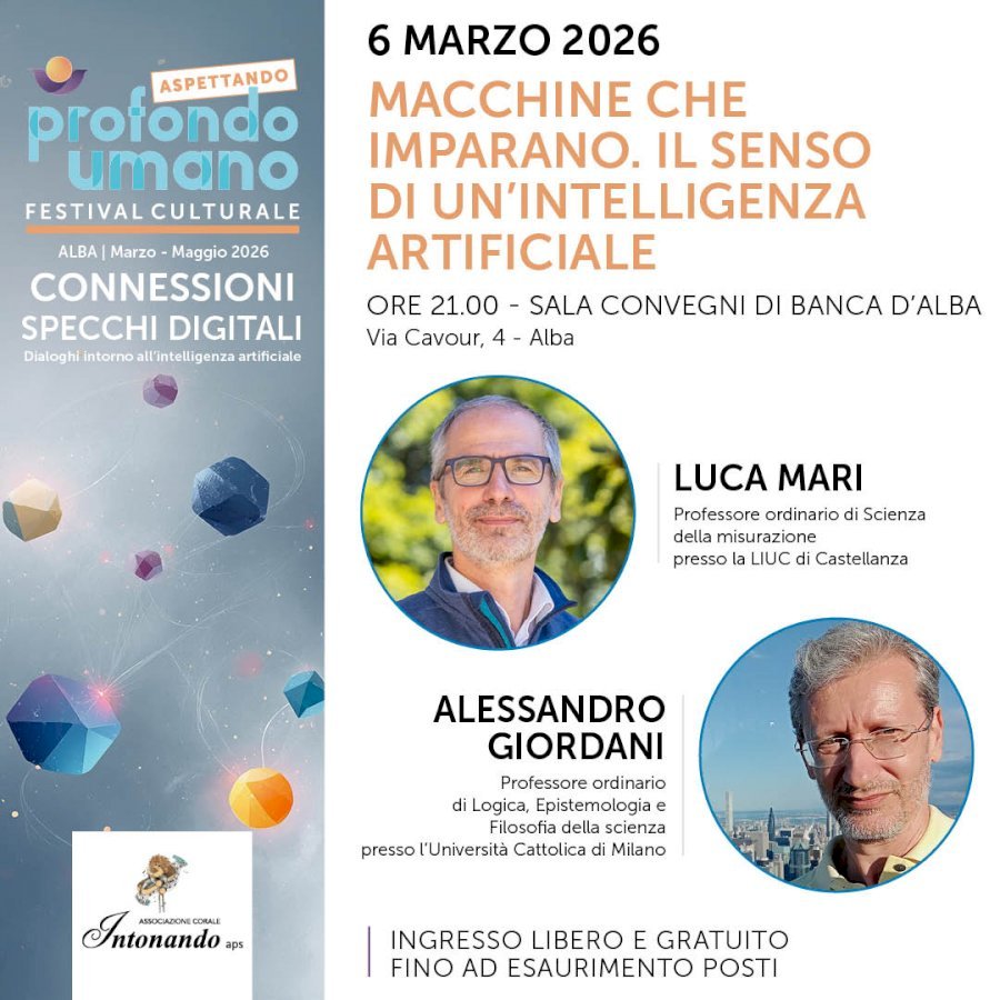 Getteremo le basi per la discussione con Luca Mari e Alessandro Giordani, ragionando sulla natura e sul senso dei chatbot per capire quali domande su noi stessi e sulla nostra conoscenza sollecitino queste novità. L'albese Elisa Giaccardi porterà, invece, il discorso sul piano etico e sociale nel tentativo di trovare un punto di equilibrio nell'uso dell'IA e, di fronte a sfide come il cambiamento climatico, aprire nuove possibilità di sopravvivenza collettiva. Insieme a Giulio Pavesi, anche lui albese, cofondatore di Termzy Al, esploreremo i rischi di una distorsione provocata da bias umani e algoritmici e approfondiremo la questione etica sulle supply chain dell'IA. Maria Chiara Carrozza ci accompagnerà in un filone di ricerca all'avanguardia, tra robotica, intelligenza artificiale generativa e interfacce brain to computer (BCI). Chiuderà la rassegna l'intervento di Roberto Defez sull'uso dell'IA nel campo delle biotecnologie, in particolare in ambito alimentare.