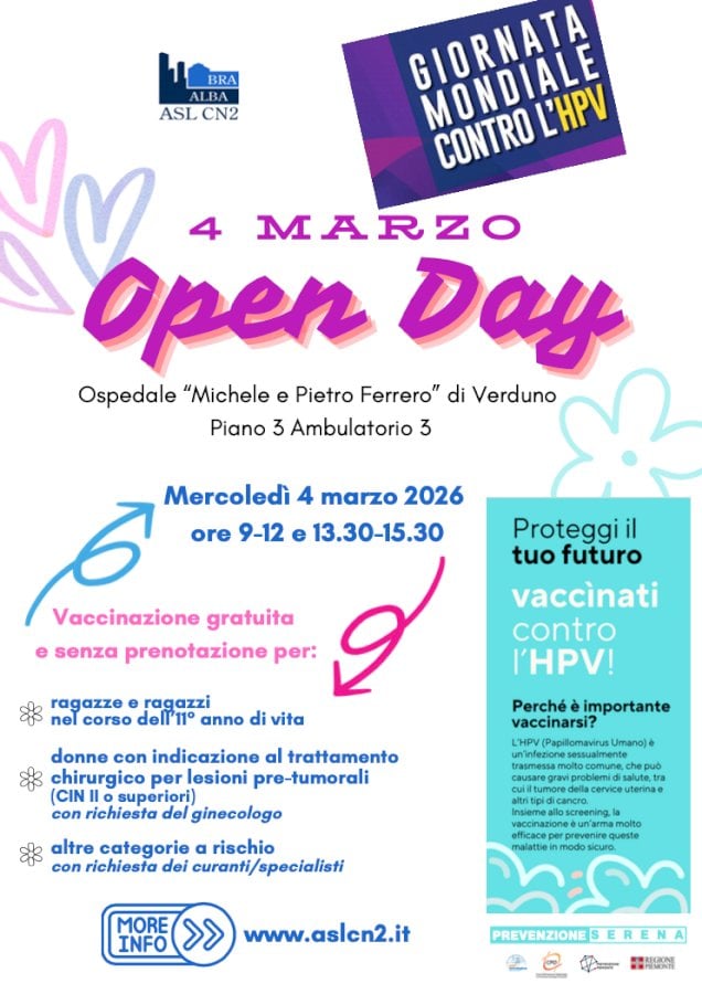 Ospedale Pietro e Michele Ferrero di Verduno, ore 9 - 12, 13.30 - 15.30 Asl Cn2 - vaccinazione - Ospedale - Verduno - Screening - HPV - Papillomavirus