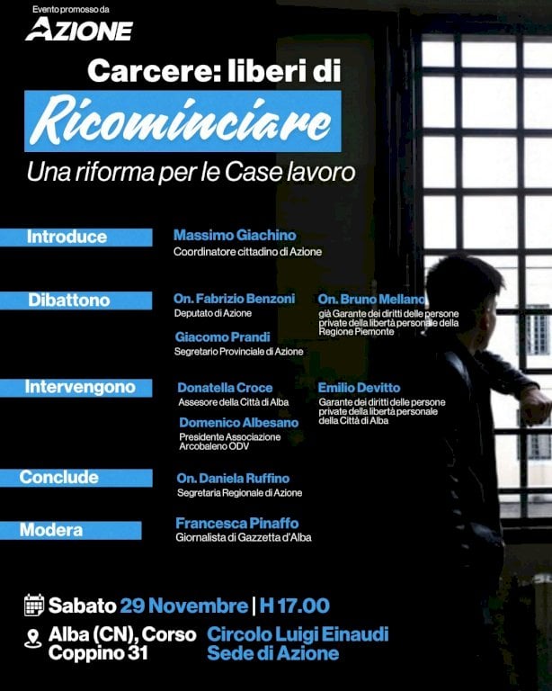 In programma il 29 novembre, sarà un'occasione per illustrare la proposta di legge del partito. Saranno presenti i deputati Benzoni e RuffinoAzione organizza un fondamentale incontro pubblico ad Alba dal titolo "Carcere: Liberi di ricominciare - Un riforma per le Case lavoro", che si terrà sabato 29 novembre alle ore 17 presso la sede del Circolo Luigi Einaudi – Azione, in Corso Coppino 31 ad Alba.