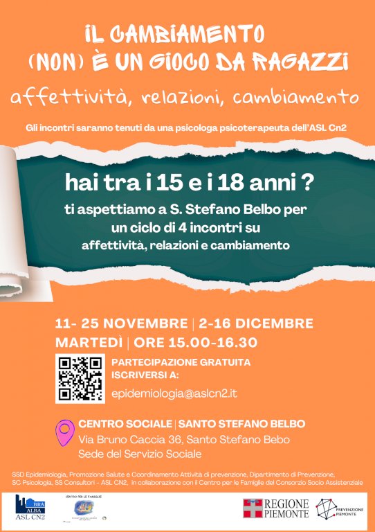 A Santo Stefano Belbo un ciclo di incontri per adolescenti su affettività, relazioni e cambiamentoA partire da martedì 11 novembre, a Santo Stefano Belbo prenderà il via “Il cambiamento (non) è un gioco da ragazzi”, un ciclo di quattro incontri dedicati agli adolescenti tra i 15 e i 18 anni, per riflettere e confrontarsi sui temi dell’affettività, delle relazioni e del cambiamento.
