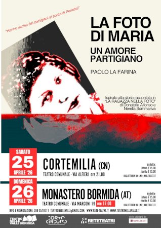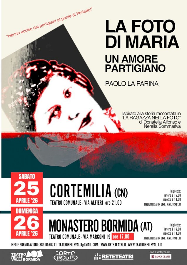 Lo spettacolo di Paolo La Farina, tratto dal libro di Donatella Alfonso e Nerella Sommariva, arriva in scena a Cortemilia e Monastero BormidaIn occasione del 25 aprile, la stagione Teatro nelle Valli Bormida 2025/2026 propone “La foto di Maria – Un amore partigiano”, spettacolo teatrale scritto e interpretato da Paolo La Farina. L’evento si terrà sabato 25 aprile alle ore 21 presso il Nuovo Teatro Comunale di Cortemilia e domenica 26 aprile alle 17 al Teatro Comunale di Monastero Bormida (AT).