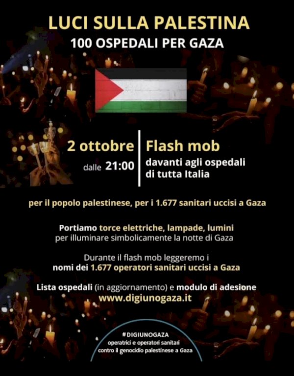 Il flash mob “Luci sulla Palestina. 100 ospedali per Gaza” è stato organizzato per non dimenticare i 1.677 sanitari uccisi nei territori palestinesi. la note verrà illuminata simbolicamente da torce elttriche, lampade e lumini. La lista degli ospedali che prenderanno parte, in constante aggiornamento, e il modulo d iscrizione si trovano al link www.digiunogaza.it.