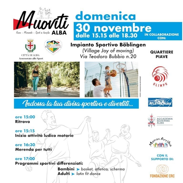 Promosso dall'Assessorato allo Sport del comune, inizierà alle 15 presso l'Impianto Sportivo Böblingen“Muoviti Alba” è un’iniziativa rivolta alle famiglie, che coinvolge grandi e piccoli in attività sportive e ludico motorie.