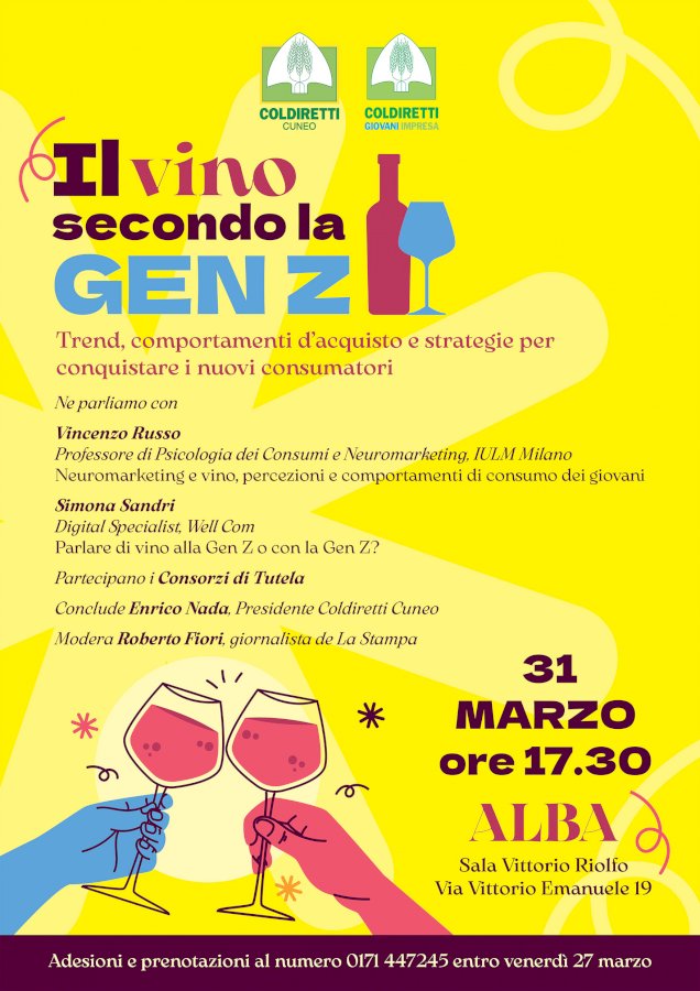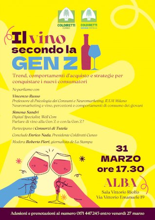 È in questo scenario che si inserisce l’incontro “Il vino secondo la Gen Z. Trend, comportamenti d’acquisto e strategie per conquistare i nuovi consumatori”, in programma martedì 31 marzo alle ore 17.30 presso la Sala Vittorio Riolfo (via Vittorio Emanuele, 19 Alba), organizzato da Coldiretti Cuneo e Coldiretti Giovani Impresa Cuneo.