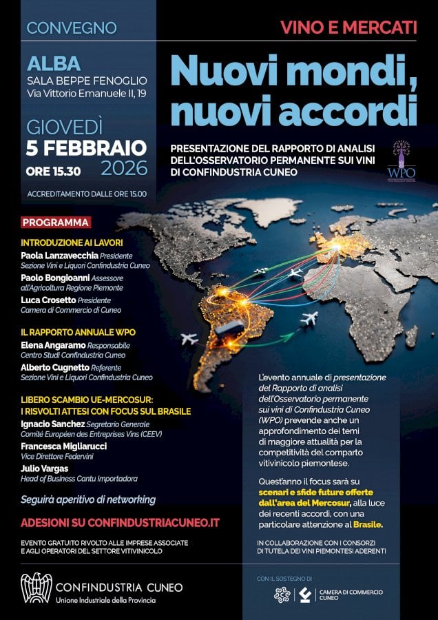 Giovedì 5 febbraio la presentazione del report annuale elaborato dal Wpo di Confindustria Cuneo volto ad analizzare le sfide future del settore vitivinicoloGiovedì 5 febbraio, a partire dalle 15.30, la Sala Beppe Fenoglio di Alba ospiterà l’edizione 2026 di “Vino e Mercati – Nuovi mondi, nuovi accordi”, l’appuntamento annuale organizzato da Confindustria Cuneo per presentare i dati elaborati dal Wine Permanent Observer (Wpo), il centro studi permanente dedicato al comparto vitivinicolo.