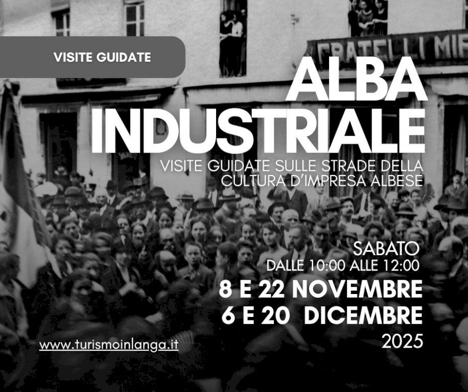 Sabato 8 e 22 novembre e sabato 6 e 20 dicembre 2025 dalle ore 10.00 alle ore 12.00, grazie al tour guidato Alba industriale, sarà possibile visitare con una guida turistica il centro storico della città viaggiando nel tempo per scoprire i siti dell’archeologia industriale albese, i luoghi di nascita delle grandi aziende oggi famose in tutto il mondo e per incontrare i grandi personaggi e le dinastie di imprenditori che, con le loro intuizioni e il loro lavoro, hanno fatto grande la nostra città.