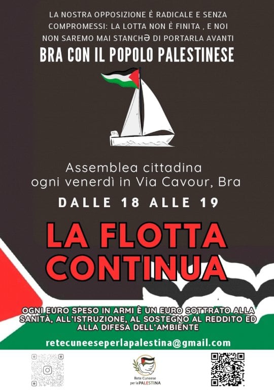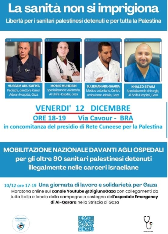 La Rete Cuneese per la Palestina si unisce all’iniziativa organizzata per chiedere la liberazione degli oltre novanta sanitari palestinesi detenuti nelle carceri israelianeLa Rete Cuneese per la Palestina a Bra si unisce, durante il presidio permanente settimanale, venerdì 12 dicembre dalle 18 alle 19 in via Cavour, ai flash-mob per la Giornata nazionale e internazionale di mobilitazione “La sanità non si imprigiona”, promossa dalle reti #DigiunoGaza e Sanitari per Gaza 10 dicembre, flash mob in oltre 50 ospedali - #DigiunoGaza per chiedere la liberazione degli oltre novanta sanitari palestinesi illegalmente detenuti nelle carceri israeliane.
