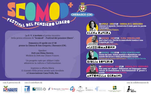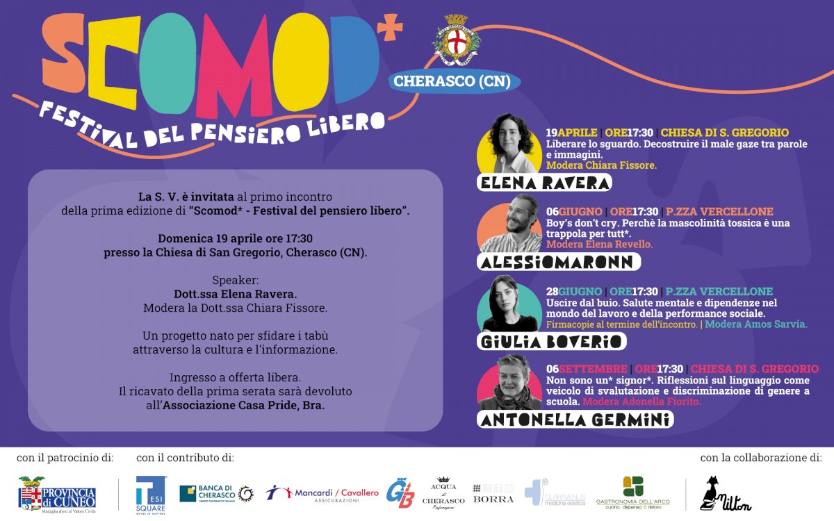 L’obiettivo è portare anche in realtà provinciali un evento capace di trattare con determinazione temi sociali rilevanti, spesso ritenuti delicati o controversiDomenica 19 aprile ci sarà il primo (di quattro appuntamenti) di Scomod* - Festival del pensiero libero: alle ore 17,30 presso la chiesa di S. Gregorio, Elena Ravera con la moderatrice Chiara Fissore tratterà il tema "Liberare lo sguardo. Decostruire il male gaze tra parole e immagini".