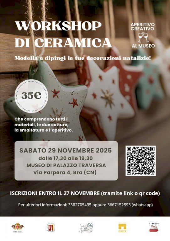 Appuntamento sabato 29 novembre alle 17.30. La prenotazione all'evento sarà obbligatoriaDopo il successo dei primi due appuntamenti, torna anche a novembre l’Aperitivo Creativo al Museo di Palazzo Traversa, con workshop di ceramica a tema natalizio. L’occasione per provare a modellare e dipingere decorazioni per il Natale in arrivo è sabato 29 novembre, dalle 17.30 alle 19.30 nelle sale del Museo di Arte, Storia e Archeologia di via Parpera. Le opere realizzate dai partecipanti verranno cotte e smaltate e potranno essere ritirate nelle settimane successive. L’incontro sarà accompagnato da un piacevole aperitivo.