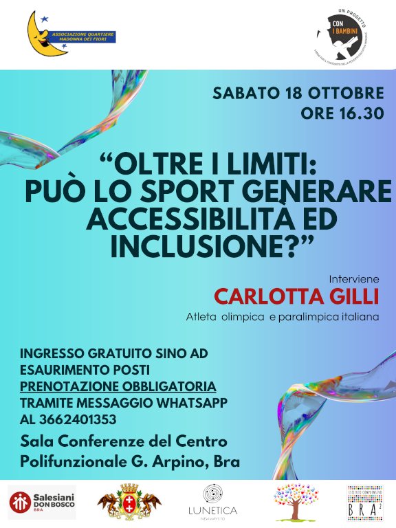 L’evento finale, dal titolo “Oltre i limiti: può lo sport generare accessibilità ed inclusione?”, si terrà sabato 18 ottobre alle ore 16.30 presso la Sala Conferenze del Centro Polifunzionale “Giovanni Arpino” di Bra e vedrà la partecipazione straordinaria di Carlotta Gilli, atleta olimpica e paralimpica italiana. L’incontro offrirà un momento di riflessione e dialogo sul potenziale dello sport come strumento di inclusione sociale, promozione dell’uguaglianza e superamento delle barriere, siano esse fisiche, culturali o sociali.