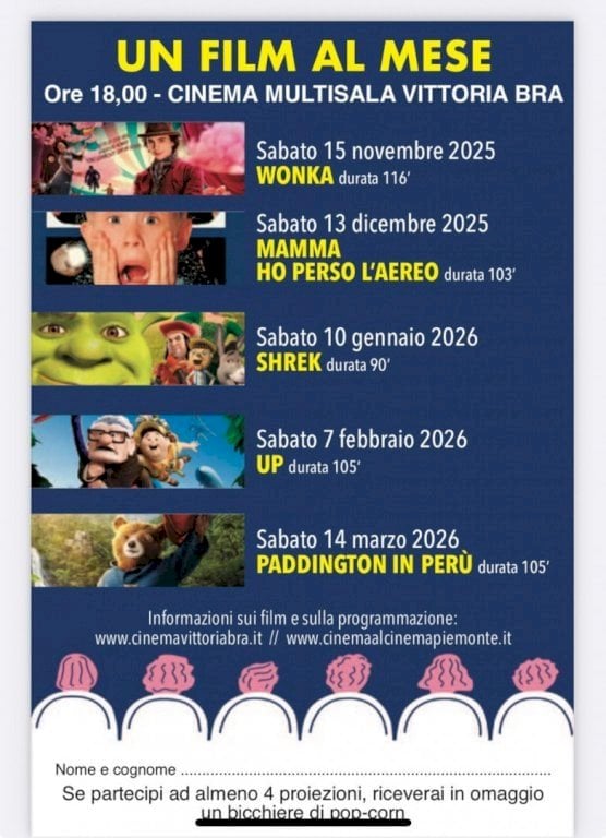 In calendario sono previsti cinque appuntamenti presso il Cinema Multisala Vittoria di via Cavour 20: sabato 15 novembre 2025 si proietta “Wonka”, il 13 dicembre sarà la volta di “Mamma ho perso l’aereo”, sabato 10 gennaio 2026 protagonista del grande schermo sarà “Shrek”, il 7 febbraio tocca a “Up”, per concludere il 14 marzo con “Paddington in Perù”.