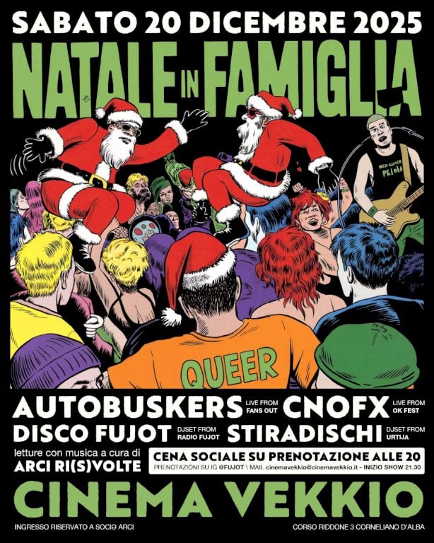 Un evento corale, organizzato grazie al contributo attivo delle realtà che da anni animano la programmazione del CVK: Radio Fujòt, OK Fest, Urtija, Fans Out e ARCI Ri(s)volte. Insieme, daranno vita a una vera e propria festa di fine anno condivisa, tra musica dal vivo, dj set, letture e momenti di socialità. La serata inizierà alle ore 20 con una cena sociale (solo su prenotazione). Poi, alle 21 e 30, inizierà lo show con l'alternarsi sul palco di Autobuskers (una delle band più rappresentative del territorio per energia e contaminazioni con un repertorio che piace proprio a tutti), Cnofx (un tributo cuneese alla band punk che rappresenta più di una generazione), Disco Fujot & Lo Stiradischi (selezioni musicali tra vinile, pop queer e suggestioni da dancefloor) e letture in musica a cura di ARCI Ri(s)volte, progetto culturale e sociale nato per promuovere parole, diritti e partecipazione. Una serata che gioca con l’immaginario del “Natale in famiglia”, trasformandolo in un’occasione per rivedere e riscrivere il significato di comunità: aperta, inclusiva, affettuosamente irriverente. Ingresso riservato a soci e socie ARCI.