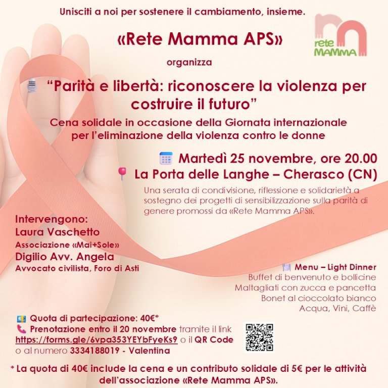 Per partecipare è richiesta la prenotazione entro il 20 novembre contattando direttamente Valentina De Ciechi al numero 3334188019 oppure a questo link. Una parte del contributo della cena sarà destinata ai progetti di sensibilizzazione promossi da “Rete Mamma APS”.