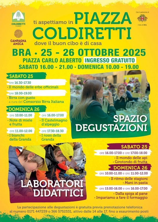Il 25 e 26 ottobre laboratori, degustazioni e attività permetteranno di scoprire da vicino il lavoro degli agricoltori e l’importanza di una cultura alimentare sana e consapevoleUn weekend all’insegna dei sapori, della sostenibilità e della conoscenza. Sabato 25 e domenica 26 ottobre Piazza Coldiretti sarà protagonista a Bra, in piazza Carlo Alberto, con un ricco programma di attività gratuite per grandi e piccini. Degustazioni, laboratori e incontri permetteranno di scoprire da vicino il lavoro degli agricoltori e l’importanza di una cultura alimentare sana e consapevole, basata su cibo genuino, stagionale e di provenienza locale.