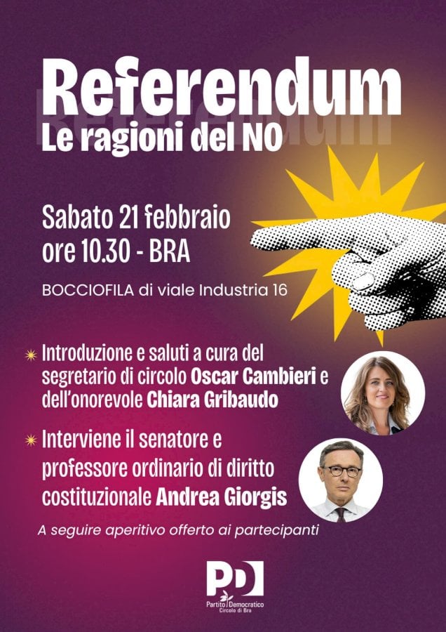 L’incontro del 21 febbraio è pensato per ascoltare, confrontarsi, fare domande e discutere. Ospiti il senatore Andrea Giorgis e l’onorevole Chiara GribaudoSabato 21 febbraio, a Bra, si parlerà di referendum e Costituzione con il senatore Andrea Giorgis, docente di Diritto costituzionale, e la vicepresidente del PD, onorevole Chiara Gribaudo.