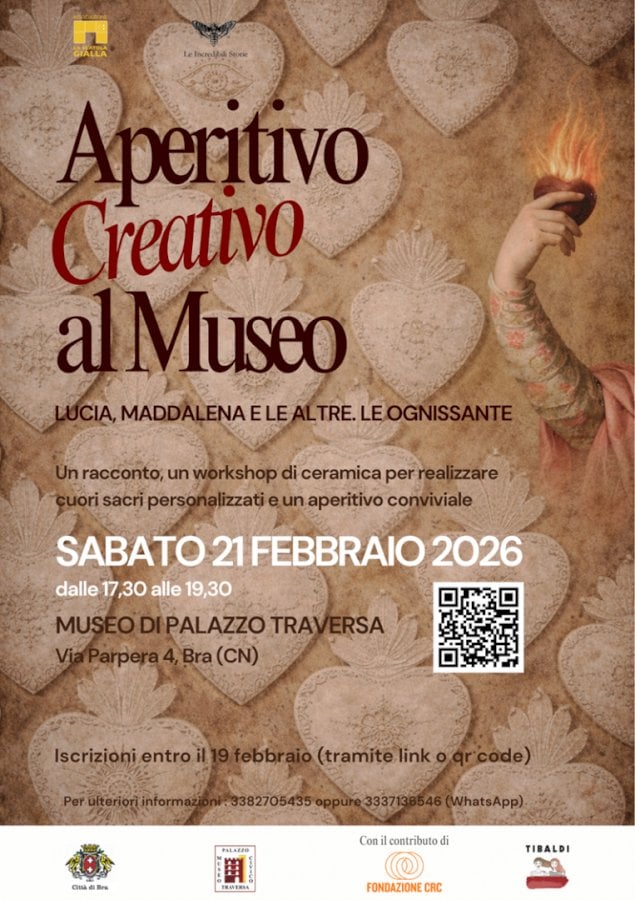 Appuntamento sabato 21 novembre alle 17.30, la prenotazione obbligatoriaTorna al Museo di Palazzo Traversa di Bra l’apprezzato appuntamento con l’Aperitivo Creativo. Sabato 21 febbraio, dalle 17.30 alle 19.30, sarà la volta di “Lucia, Maddalena e le altre. Le Ognissante”: un viaggio tra storie e simboli femminili attraverso un racconto ispirante, a cura di “Le Incredibili storie”, seguito da un workshop di ceramica per creare il tuo cuore sacro personalizzato. A chiudere, un aperitivo conviviale per condividere idee, emozioni e bellezza, nel cuore del museo.