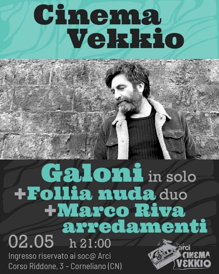 Sabato 2 maggio dalle ore 21 il palco del circolo Arci ospita Galoni, Follia Nuda e Marco Riva ArredamentiSabato 2 maggio, dalle ore 21, il palco del circolo ARCI ospiterà tre progetti diversi ma accomunati da una forte identità narrativa e sonora: Galoni, Follia Nuda e Marco Riva Arredamenti. Ingresso libero riservato a socie e soci Arci.