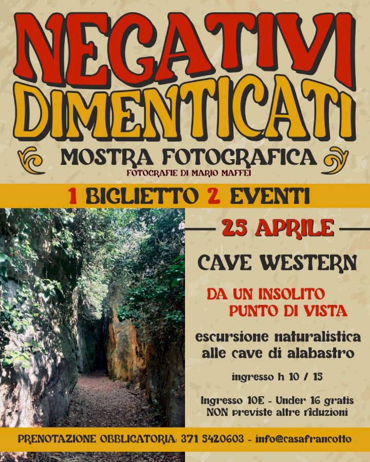 Lo staff di Casa Francotto ha inoltre annunciato un ricco calendario di appuntamenti. Si inizia sabato 25 aprile con un evento che unisce cultura e territorio: una visita guidata alle cave di alabastro con guida naturalistica (biglietto unico mostra + evento a 10 euro). "I canyon sulla collina di Busca - spiegano gli organizzatori - richiamano le atmosfere e le ambientazioni dei film western degli anni Sessanta". L’evento è organizzato dal Comune di Busca -Assessorato alla Cultura - e dall’associazione Monviso Arte APS.