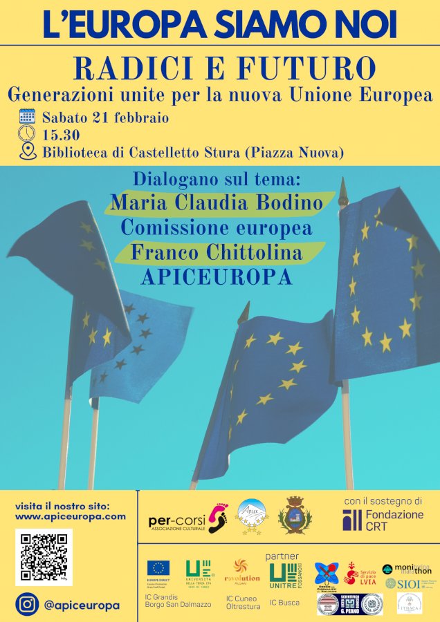 L'incontro è realizzato da Apiceuropa, l’associazione culturale Per-Corsi e il Comune di Castelletto Stura, con il sostegno della Fondazione CRT nell’ambito del progetto “L’Europa siamo noi”.