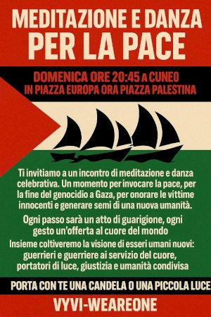 “Crediamo che un vero cambiamento – personale, collettivo e sociale – possa avvenire solo quando includiamo la dimensione interiore, coltivando la consapevolezza e l’energia necessarie per accedere all’intelligenza emotiva e intuitiva del cuore. Quello che sta accadendo nel mondo, in particolare a Gaza, ci tocca profondamente e ci motiva ancora di più a proseguire la missione della nostra associazione”. Con questa dichiarazione l'associazione, in collaborazione con il Comitato Cuneo_per_Gaza, ha deciso di organizzare domenica 5 ottobre a Cuneo un incontro di meditazione e danza celebrativa.