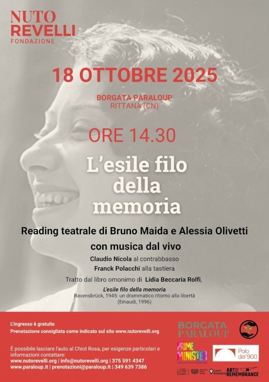 Lo spettacolo è tratto dal libro "L'Esile filo della memoria" e si svolgerà sabato 18 ottobre alle 14.30. Si inserisce all'interno della rassegna"Attraverso la memoria"Sabato 18 ottobre alle ore 14.30, a Borgata Paraloup, si terrà un evento commemorativo per il centenario della nascita di Lidia Beccaria Rolfi. In programma il reading teatrale "L’esile filo della memoria", di Bruno Maida - autore del recente Non si è mai ex deportati. Una biografia di Lidia Beccaria Rolfi (Einaudi, 2025) - e Alessia Olivetti, con musica dal vivo eseguita da Claudio Nicola (contrabbasso) e Franck Polacchi (tastiera).