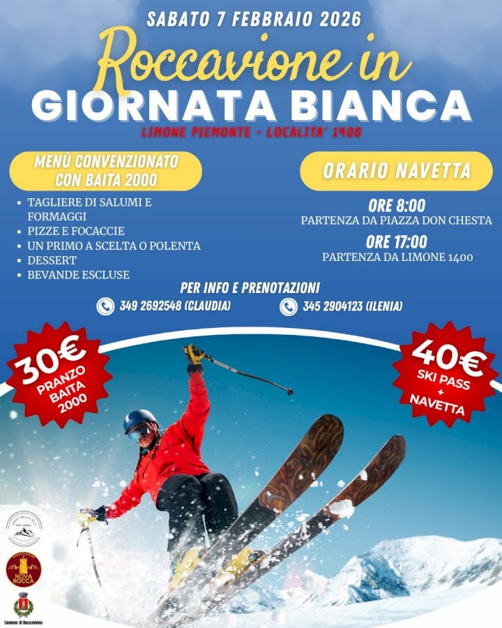Il Comune di Roccavione, in collaborazione con le associazioni locali, organizza “Roccavione in Giornata Bianca”, in programma sabato 7 febbraio a Limone Piemonte – Località 1400.