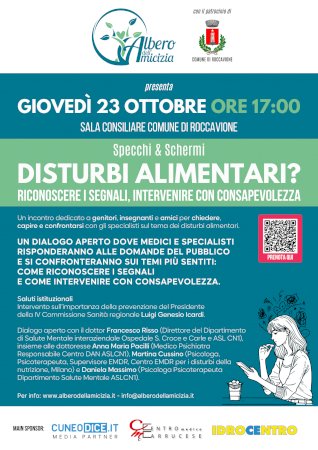 Giovedì 23 ottobre alle ore 17 l'incontro pubblico organizzato dal Comune insieme a "L'Albero dell'Amicizia"Il Comune di Roccavione e “L’Albero dell’Amicizia”, invitano famiglie, insegnanti e cittadini al primo appuntamento del ciclo “Specchi & Schermi”, dedicato a capire e riconoscere i segnali dei disturbi alimentari in adolescenti e preadolescenti e a come intervenire con consapevolezza. L’incontro si terrà giovedì 23 ottobre alle ore 17 nella Sala Consiliare del Comune di Roccavione. Un’opportunità unica per la popolazione che desidera essere informata e fugare qualsiasi dubbio su temi di sicuro interesse e molto importanti per tutte le famiglie.