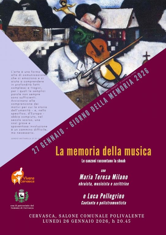 L'appuntamento è per la sera della vigilia, lunedì 26 gennaio, alle ore 20.45, nel salone comunale polivalente, con ingresso liberoAnche quest’anno Vivere Cervasca odv, con il patrocinio del Comune, propone una serata in occasione del Giorno del Ricordo, che commemora la liberazione del campo di sterminio di Auschwitz. Partendo dalle parole pronunciate alcuni anni fa dal presidente Mattarella in occasione di un precedente Giorno della Memoria, "l'arte è una forma alta di comunicazione che ci emoziona e ci aiuta a comprendere in profondità fatti complessi e tragici", si presenta un tema interessante: musica e shoah. L'argomento sarà sviluppato con parole e canti da un'esperta di cultura e lingua ebraica: Maria Teresa Milano, ebraista, musicista e scrittrice, accompagnata da Luca Pellegrino, cantante e polistrumentista, con esperienza in vari gruppi musicali.