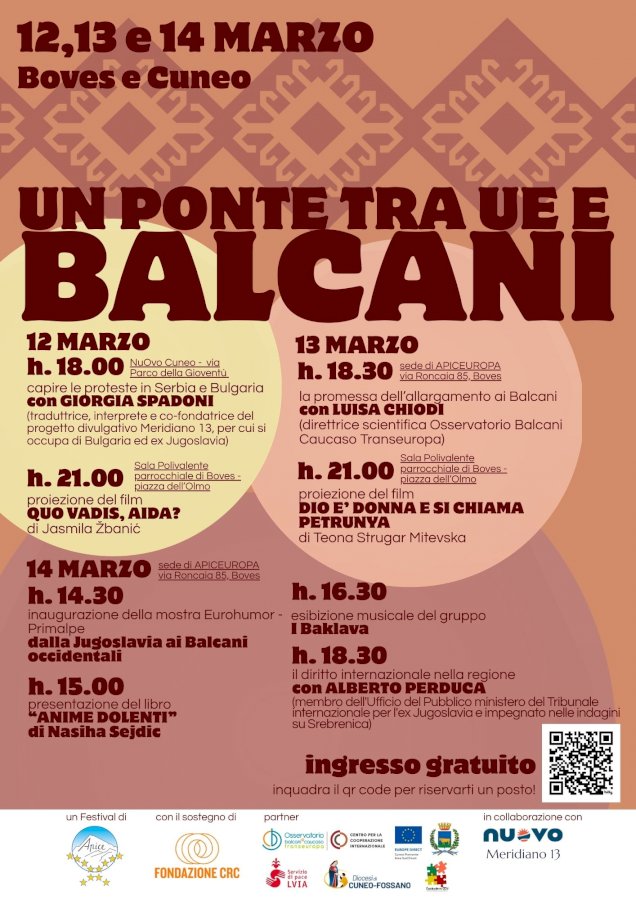 Venerdì 13 marzo si apre alle 18.30 (presso la sede di Apiceuropa, via Roncaia 85, Boves) con l’incontro “La promessa dell’allargamento ai Balcani” con Luisa Chiodi, direttrice scientifica dell’Osservatorio Balcani e Caucaso Transeuropa, approfondirà lo stato del processo di adesione dei Paesi balcanici all’UE, anche alla luce delle nuove dinamiche geopolitiche seguite alla guerra in Ucraina. Alle 21.00 (Salone Polivalente parrocchiale, in piazza dell’Olmo, Boves) sarà proiettato il film “Dio è donna e si chiama Petrunya” di Teona Strugar Mitevska, opera che affronta con ironia e forza i temi dei diritti e delle tradizioni nei Balcani.