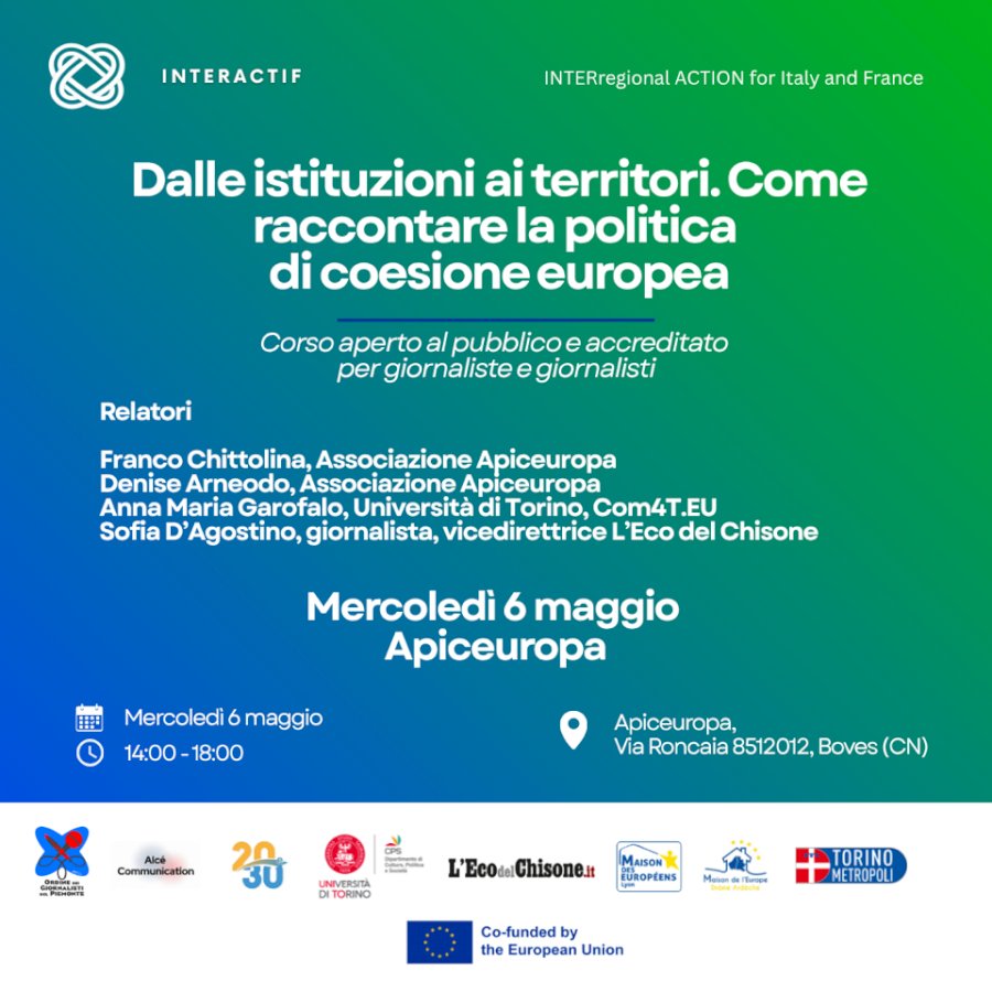 L'incontro si terrà a Boves presso la sede dell'associazione mercoledì 6 maggio dalle ore 14 alle ore 18Mercoledì 6 maggio dalle 14 alle 18 la sede di Apiceuropa (via Roncaia 85, Boves) ospiterà l’incontro formativo rivolto ai giornalisti e organizzato nell’ambito del progetto Interactif “Dalle istituzioni ai territori. Come raccontare la politica di coesione europea”.