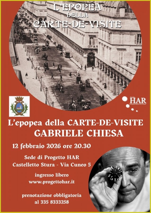 Giovedì 12 febbraio alle ore 20.30, nella medesima sede, ci sarà la presenza di Gabriele Chiesa che presenterà il suo ultimo libro “L’Epopea della Carte de Visite”.
