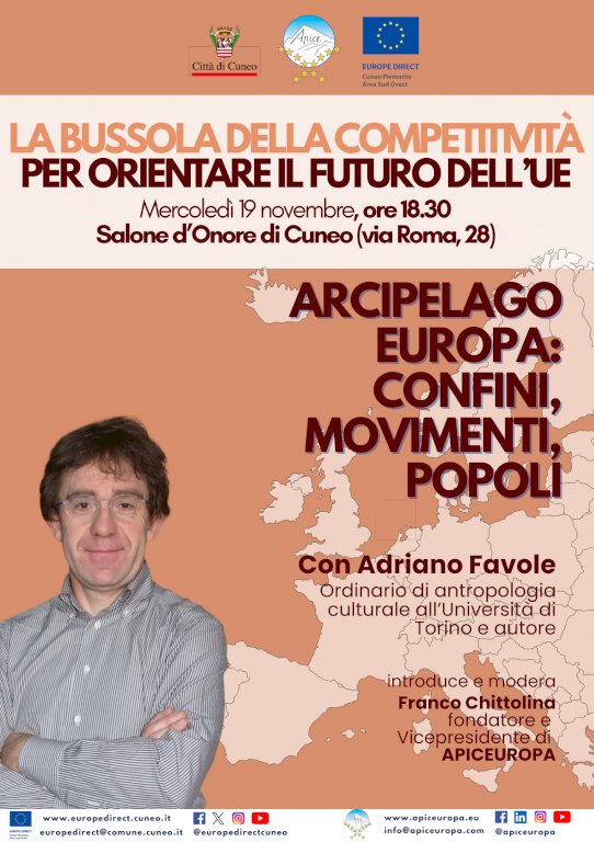 Relatore dell’incontro sarà Adriano Favole: antropologo culturale, professore ordinario all'Università di Torino, visiting professor all'Università della Nuova Caledonia e autore. Modera l’intervento Franco Chittolina, fondatore e vicepresidente di Apiceuropa. L’evento, organizzato da Apiceuropa (Associazione Per L’Incontro Delle Culture In Europa) e dal Centro Europe Direct Cuneo Piemonte Area Sud Ovest avrà luogo mercoledì 19 novembre 2025 alle ore 18.30, presso il Salone d’Onore del Comune di Cuneo (via Roma 28, Cuneo).