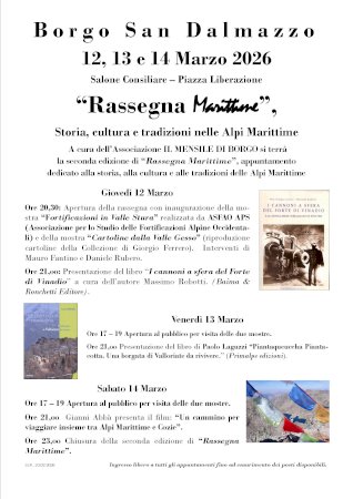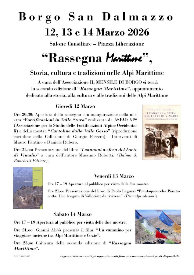 L'evento inizierà il 12 marzo e si concluderà il 14. Ingresso libero fino ad esaurimento postiA cura dell’Associazione Il mensile di Borgo si terrà la seconda edizione di “Rassegna Marittime”, un appuntamento dedicato alla storia, alla cultura e alle tradizioni delle Alpi Marittime. Il programma è il seguente: