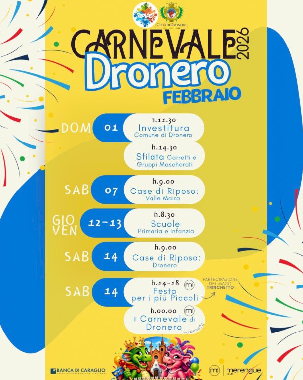 Nei giorni successivi il Carnevale coinvolgerà il territorio con momenti di festa dedicati alle case di riposo della valle Maira e di Dronero, oltre alle scuole primarie e dell’infanzia, portando musica, colori e allegria a tutte le generazioni. Il momento clou sarà sabato 14 febbraio, con una festa per i più piccoli dalle 14 alle 18, arricchita dalla partecipazione del Mago Trinchetto, e a seguire il grande evento serale con Il Carnevale di Dronero – edizione 2026, per celebrare insieme la tradizione carnevalesca della città.