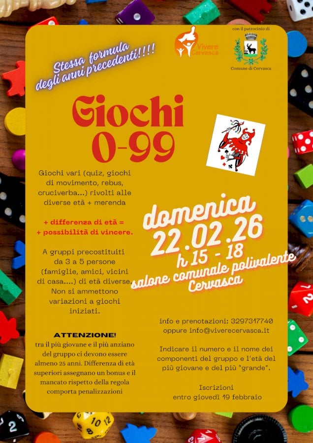 Organizzati da Vivere Cervasca odv, si svolgeranno domenica 22 febbraio dalle 15 fino alle 18Domenica 22 febbraio tornano i Giochi 0/99 proposti da Vivere Cervasca odv.
