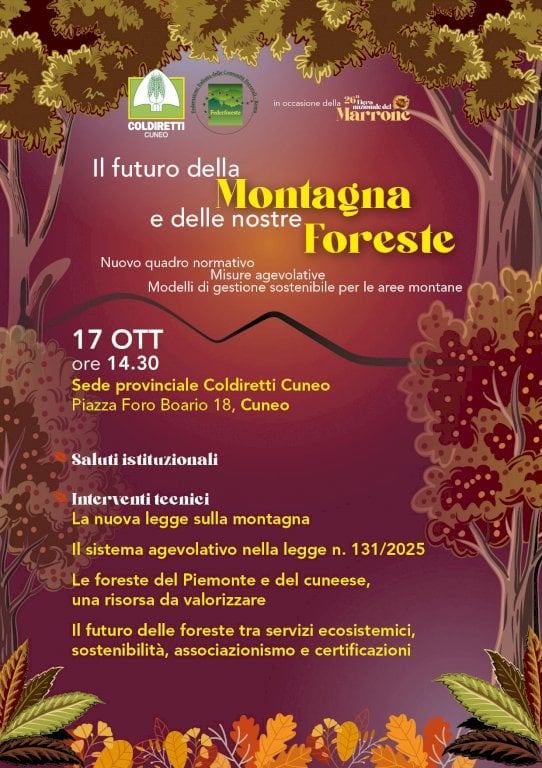 Esperti e istituzioni a confronto il 17 ottobre a Cuneo per discutere di sostenibilità, gestione forestale e opportunità fiscali per le aree montane“L’approvazione definitiva della nuova legge sulla montagna segna un passaggio storico per il futuro delle aree alpine italiane. Dopo anni di attesa, il provvedimento introduce strumenti concreti per sostenere le comunità locali, contrastare lo spopolamento e valorizzare le risorse naturali, con l’obiettivo di rendere le terre alte più vivibili, produttive e protagoniste dello sviluppo del Paese”. In questo contesto di rinnovata attenzione verso la montagna, venerdì 17 ottobre, nell’ambito della 26ª edizione della Fiera nazionale del Marrone, la sede provinciale di Coldiretti Cuneo ospiterà il convegno “Il futuro della montagna e delle nostre foreste”, organizzato in collaborazione con Federforeste.