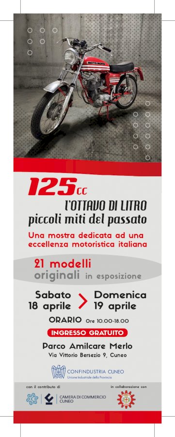 Sabato 18 e domenica 19 aprile il parco “Amilcare Merlo” ospiterà oltre venti modelli del “primo amore” motociclistico di milioni di italianiForte del riscontro ottenuto con le precedenti esposizioni, Confindustria Cuneo presenta un nuovo appuntamento dedicato a un altro mito italiano delle due ruote. La mostra, intitolata “125cc: l’ottavo di litro, piccoli miti del passato”, si inserisce nel percorso già tracciato dalle precedenti iniziative, che hanno celebrato altre icone del mondo dei motori, come “Le 175cc, moto che hanno segnato un’epoca”, “Vincenzo Lancia: quando l’ingegneria incontra il design”, “50cc: le due ruote che hanno messo in moto l’Italia” e la celebre mostra dedicata alla Vespa 50 special.